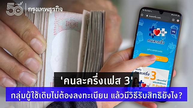1 from โครงการคนละครึ่งเฟส 3 ลงทะเบียนยังไง ต้องกดใหม่ไหม ใครได้บ้าง วันนี้เราสรุปคำตอบมาให้แล้ว. วิธีลงทะเบียน เข้าร่วมโครงการ คนละครึ่ง เฟส 3 เพื่อรับสิทธิ์เงิน 3,000 บาท สามารถลงทะเบียนได้ 2 ช่องทาง ผ่าน www.คนละครึ่ง.com และ แอปฯ เป๋าตัง โครงการ คนละครึ่งเฟส 3 รับสิทธิ์ 3,000 บาท ลงทะเบียน 14 มิ.ย. เปิดวิธีลงทะเบียน คนละครึ่ง ฉบับเข้าใจง่าย เพื่อรับสิทธิ์เงินซื้อของ 3,000 บาท หรือวันละไม่เกิน 150 บาท/วัน โดยขั้นตอนง่ายๆ ไม่ยุ่งยาก ครม ไฟเขียวอนุมัติโครงการคนละครึ่งเฟส 3 ให้คนละ 3,000 บาทใช้จ่ายผ่ายแอปเป๋าตังยาวถึงธันวาคม 2564 เริ่มกดรับสิทธิ์ กรกฏาคม 2564 วิธีลงทะเบียน คนละครึ่งเฟส 3 ใช้แอพเป๋าตัง ละเอียดทุกขั้นตอนสมัคร. คนละครึ่งเฟส3 เปิดขั้นตอนและวิธีใช้สิทธิบนแอปเป๋าตัง หลังได้รับเงินเยียวยาจำนวน 3,000 บาท เช็กที่นี่. ลงทะเบียนคนละครึ่ง เฟส 3 ผ่าน www.คนละครึ่ง.com เริ่ม 14 มิ.ย.